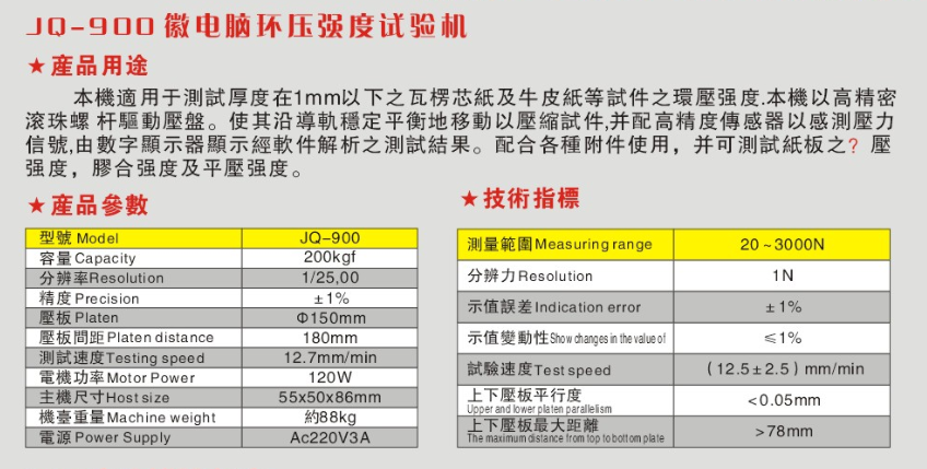 JQ-900 壓縮強度測試儀 紙品類環(huán)壓邊壓測試機 邊壓試驗機技術(shù)參數(shù):
