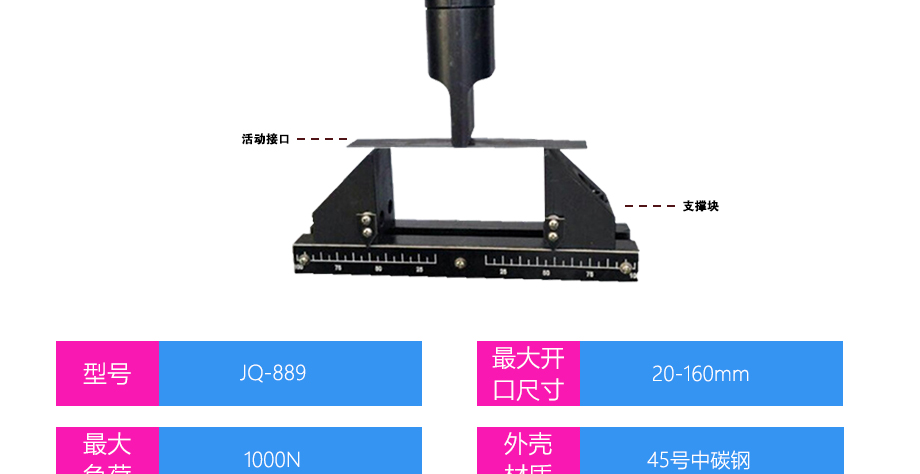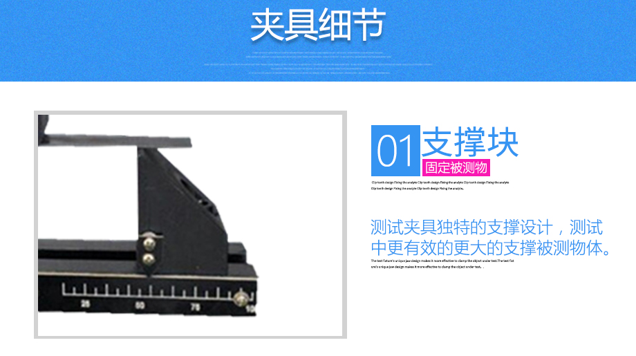 產品型號:JQ-889 品牌:劍 喬 用途:三點彎曲夾具適用范圍:鋼材、板材等材料的拉力,破壞力測試。